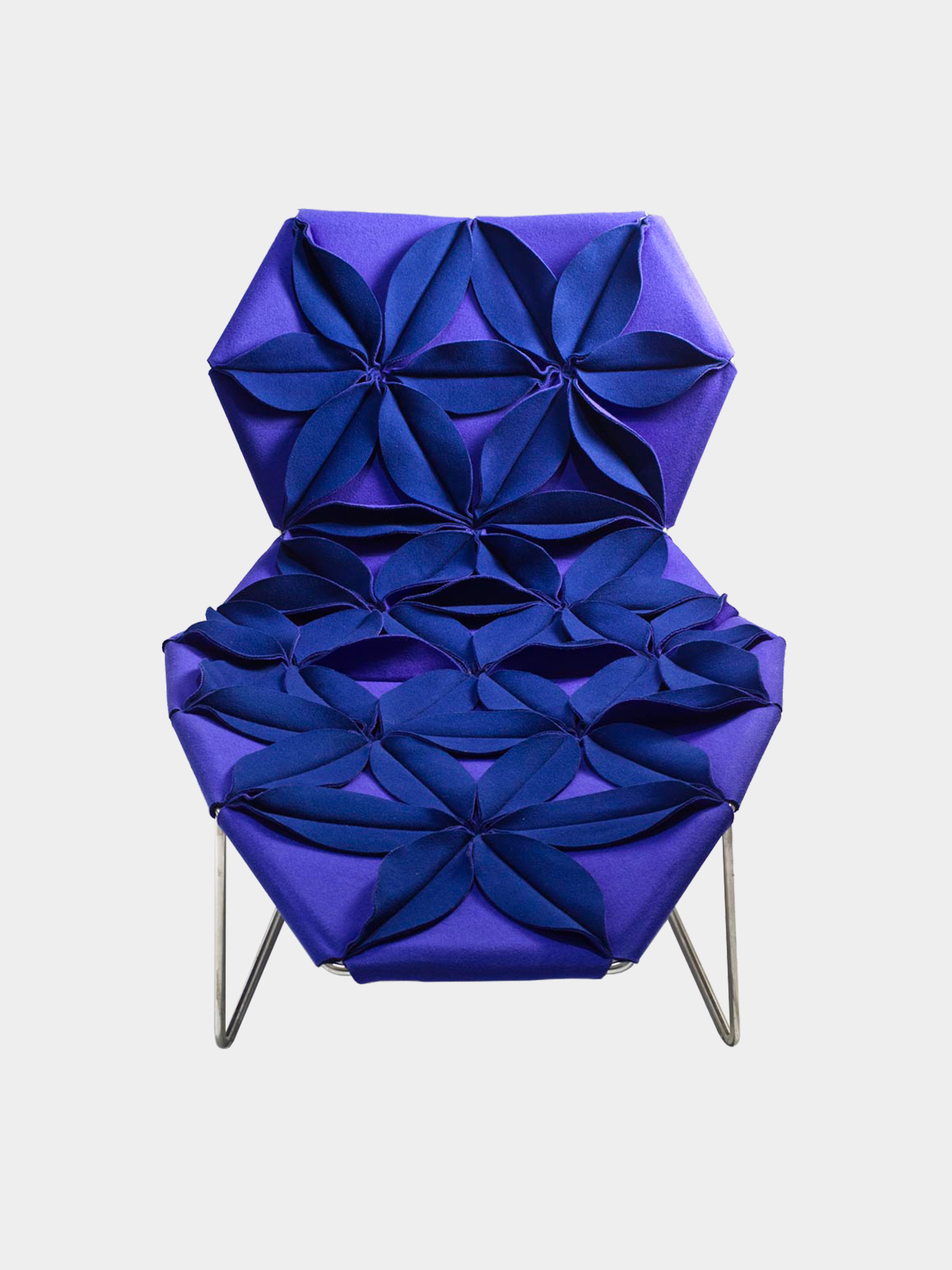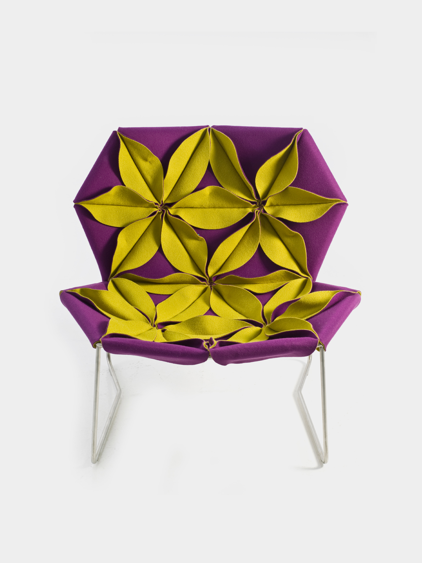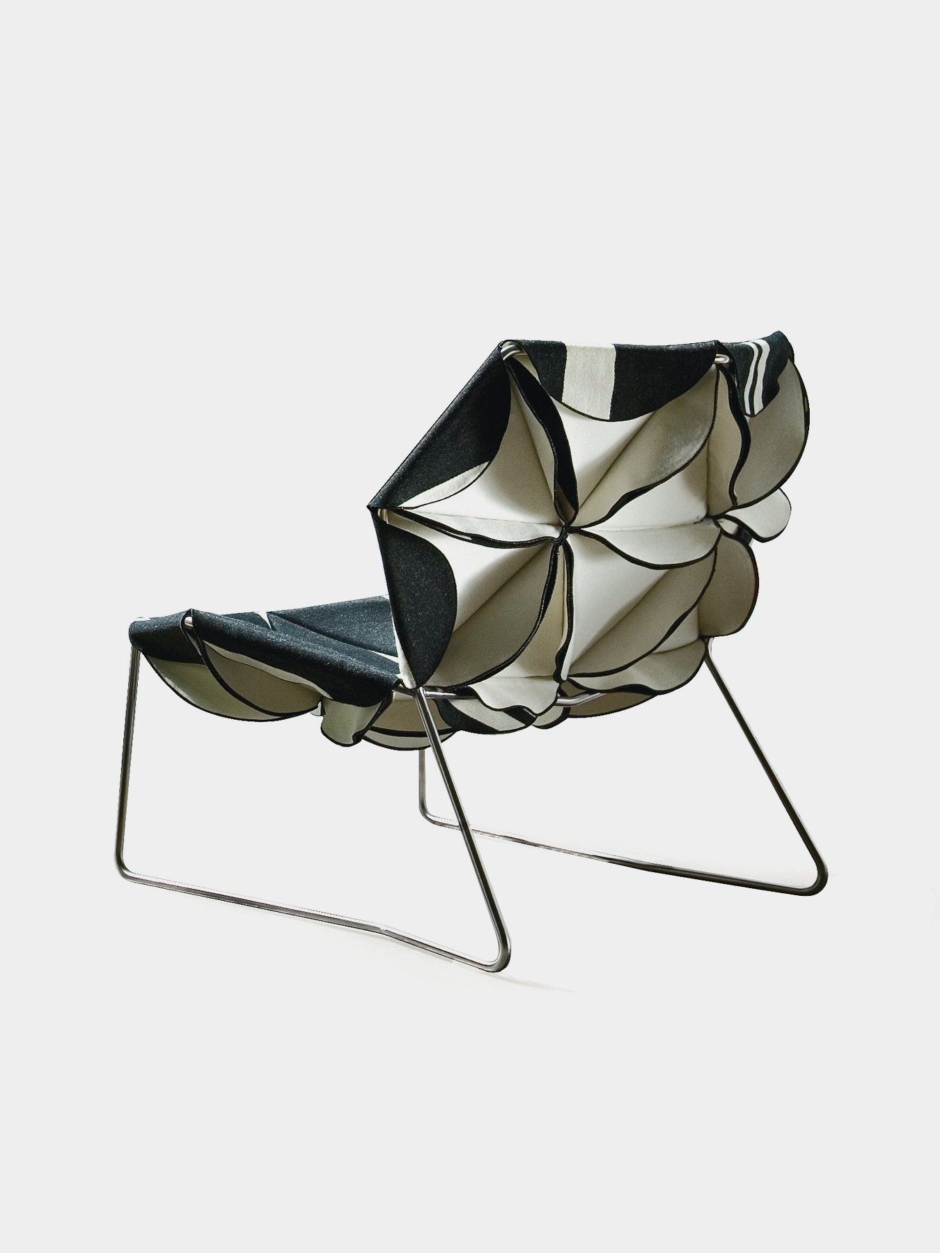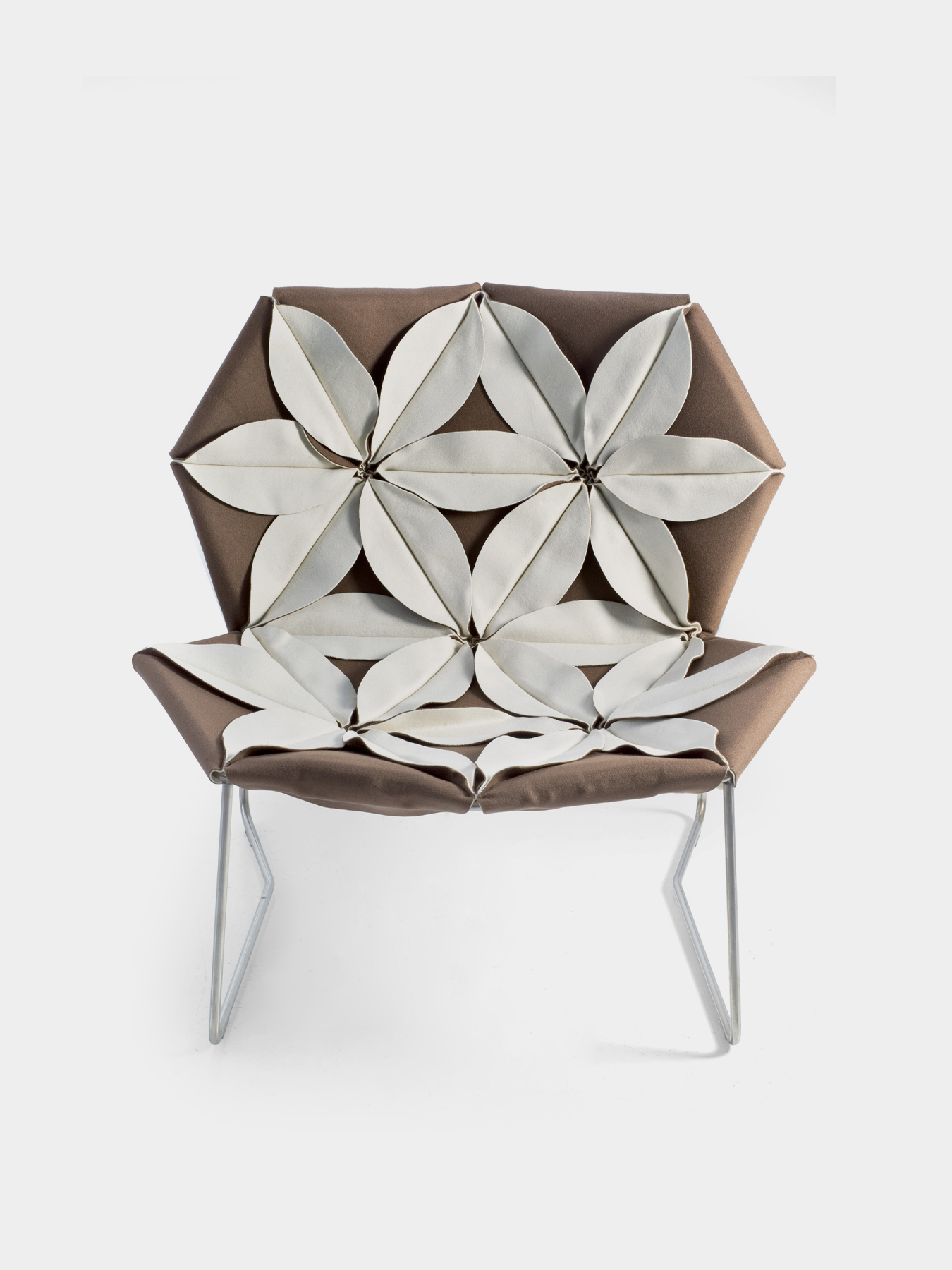 Una forma nuova per una seduta non imbottita, geometria tridimensionale sviluppata partendo dalla genesi cellulare di petali cuciti seguendo l’ordine di una struttura grafica a base triangolare. L’esito è un’esplosione floreale, prodigiosa manifestazione simbolica della fertilità. Antibodi è energia vitale, archetipo di grande e ambivalente fascino. I petali danno vita a un rivestimento portante, successivamente fissato al telaio in acciaio inox. Il rivestimento assume una doppia funzione, accogliente, femminile con i petali rivolti verso l’alto, volutamente severa e matelassé con i petali rivolti verso il basso. Antibodi è disponibile anche in versione chaise longue, con un vero e proprio “tappeto floreale” che ne accompagna tutta la superficie di seduta.
