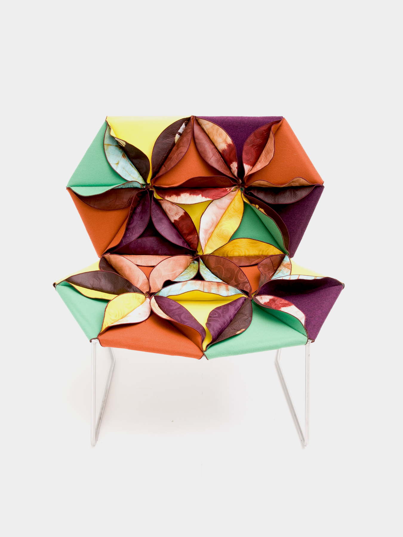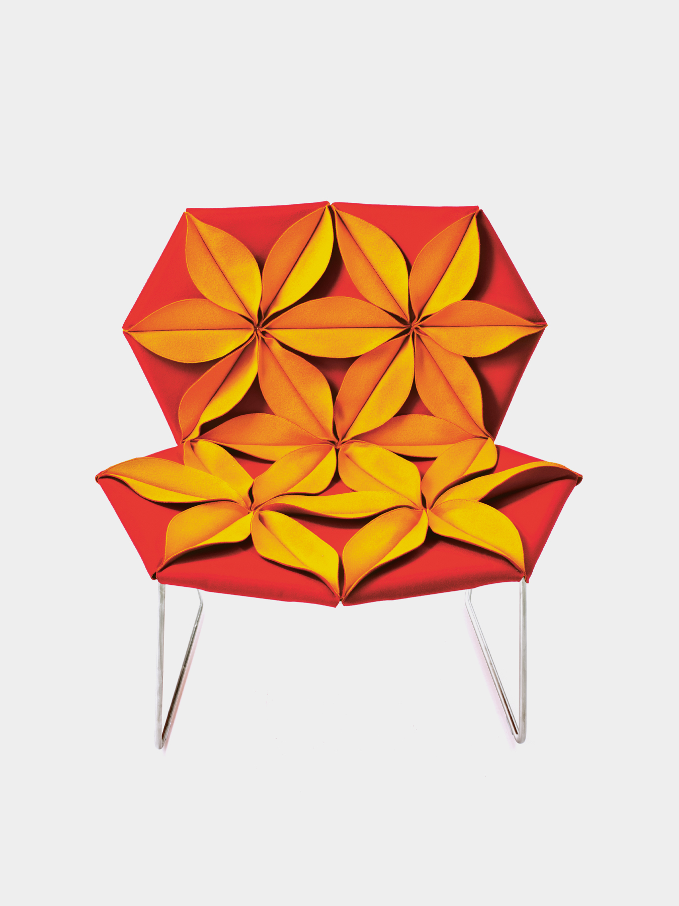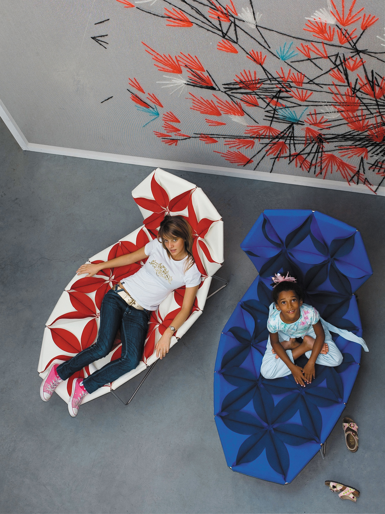 Una forma nuova per una seduta non imbottita, geometria tridimensionale sviluppata partendo dalla genesi cellulare di petali cuciti seguendo l’ordine di una struttura grafica a base triangolare. L’esito è un’esplosione floreale, prodigiosa manifestazione simbolica della fertilità. Antibodi è energia vitale, archetipo di grande e ambivalente fascino. I petali danno vita a un rivestimento portante, successivamente fissato al telaio in acciaio inox. Il rivestimento assume una doppia funzione, accogliente, femminile con i petali rivolti verso l’alto, volutamente severa e matelassé con i petali rivolti verso il basso. Antibodi è disponibile anche in versione chaise longue, con un vero e proprio “tappeto floreale” che ne accompagna tutta la superficie di seduta.