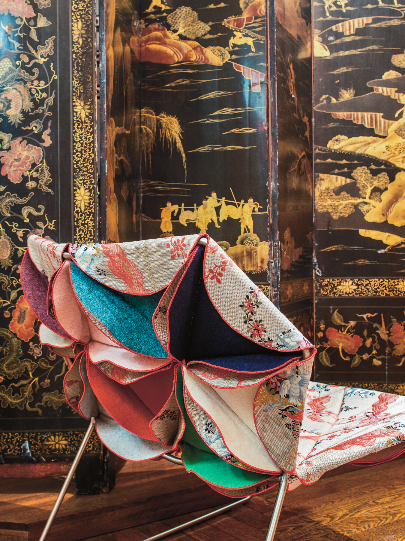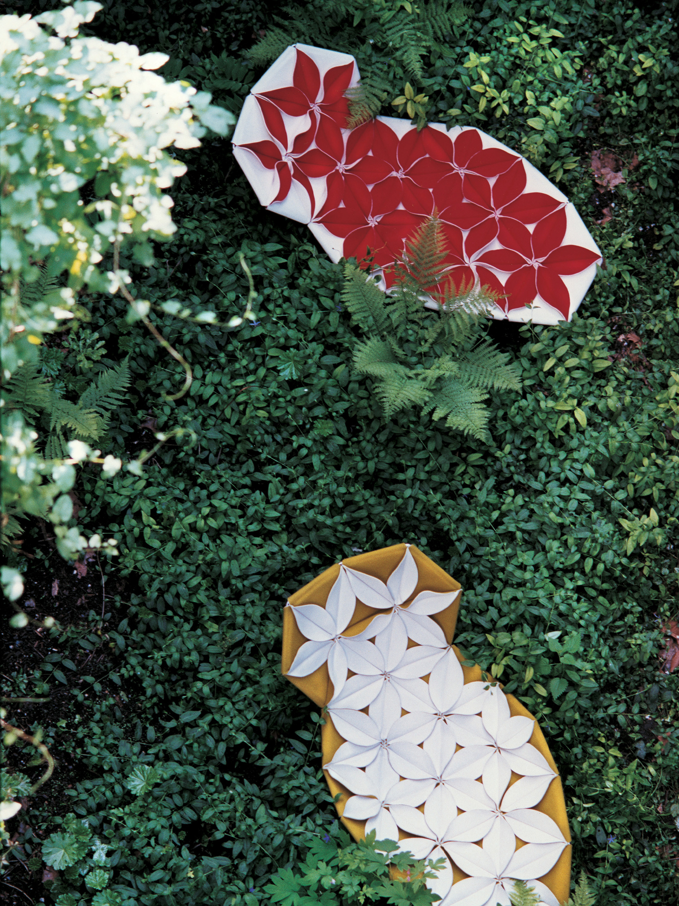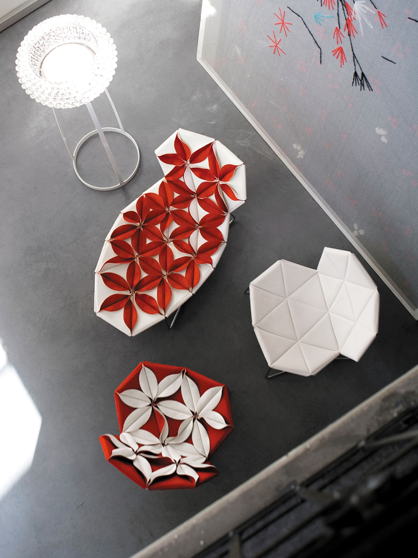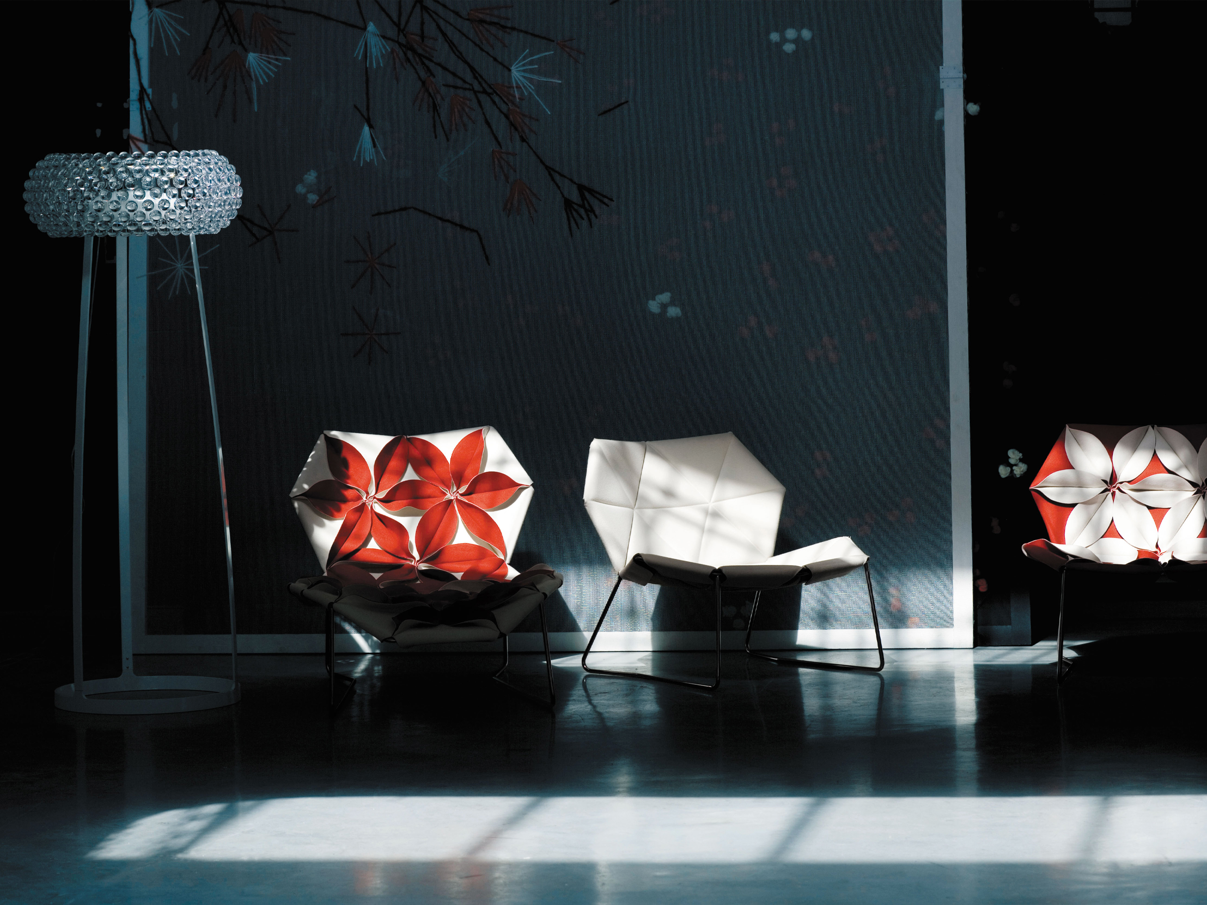 Una forma nuova per una seduta non imbottita, geometria tridimensionale sviluppata partendo dalla genesi cellulare di petali cuciti seguendo l’ordine di una struttura grafica a base triangolare. L’esito è un’esplosione floreale, prodigiosa manifestazione simbolica della fertilità. Antibodi è energia vitale, archetipo di grande e ambivalente fascino. I petali danno vita a un rivestimento portante, successivamente fissato al telaio in acciaio inox. Il rivestimento assume una doppia funzione, accogliente, femminile con i petali rivolti verso l’alto, volutamente severa e matelassé con i petali rivolti verso il basso. Antibodi è disponibile anche in versione chaise longue, con un vero e proprio “tappeto floreale” che ne accompagna tutta la superficie di seduta.